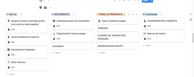 Pero no siempre era tan manual. En realidad, la mayor parte de las veces me dejaba llevar por la utilidad de la tecnología y usaba las vistas de tablero de Notion -que para mí era como un Kanban puramente digital-; sin embargo, aquella vez me sentía inspirada y utilicé un corcho con pequeños papeles cuadrados y bolígrafos de colores.